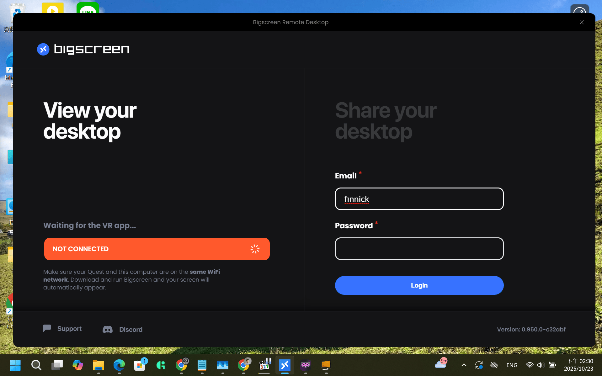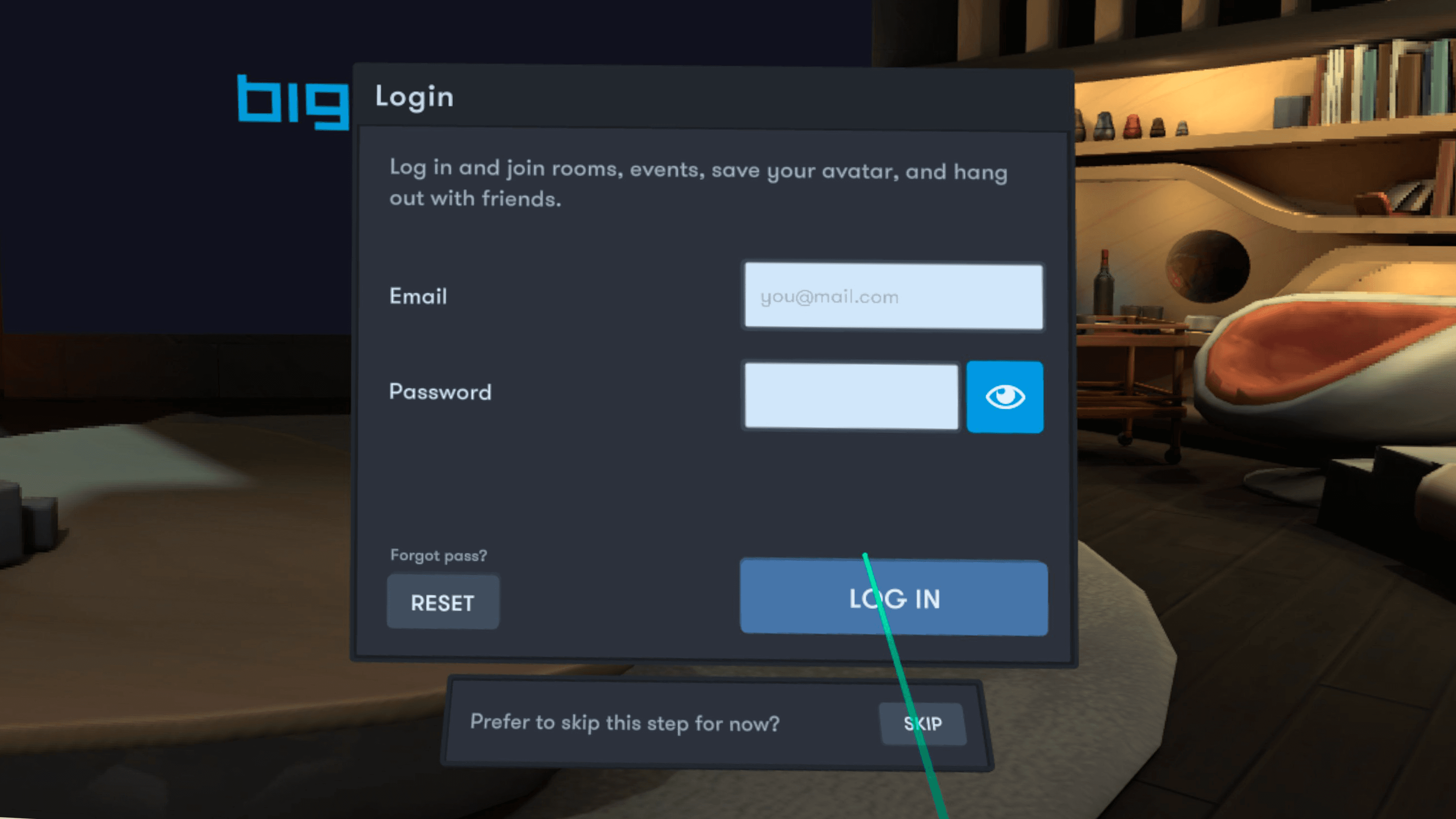 Enter your account: Put on your headset, open the Bigscreen app, and log in to your account.