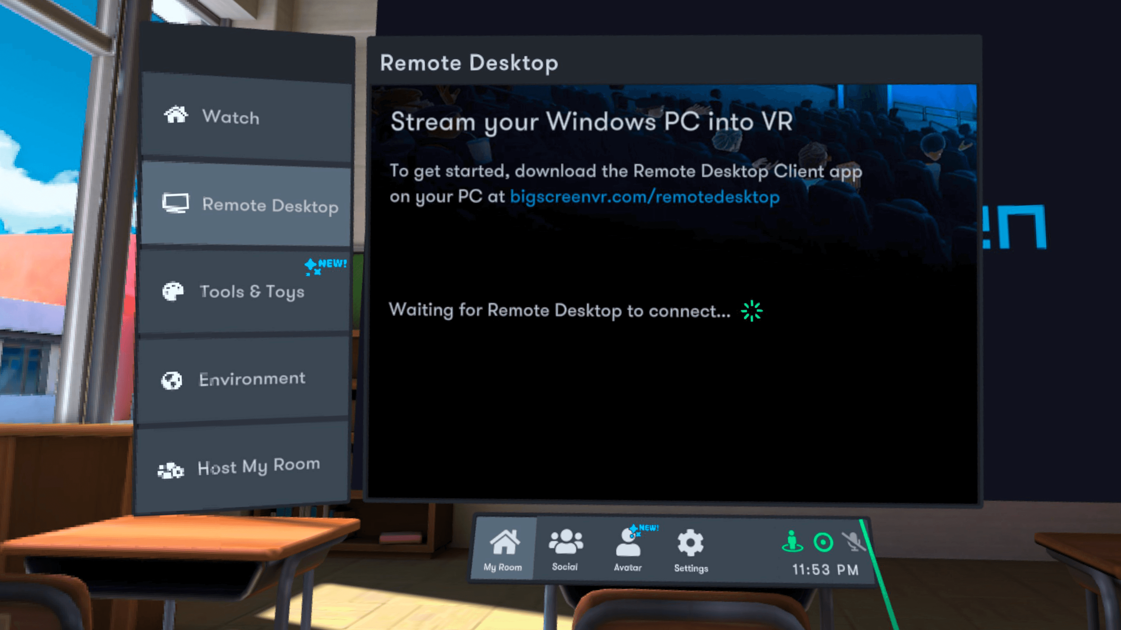Find Remote Desktop: Open the Bigscreen menu. Look under "My Room" and find "Remote Desktop."