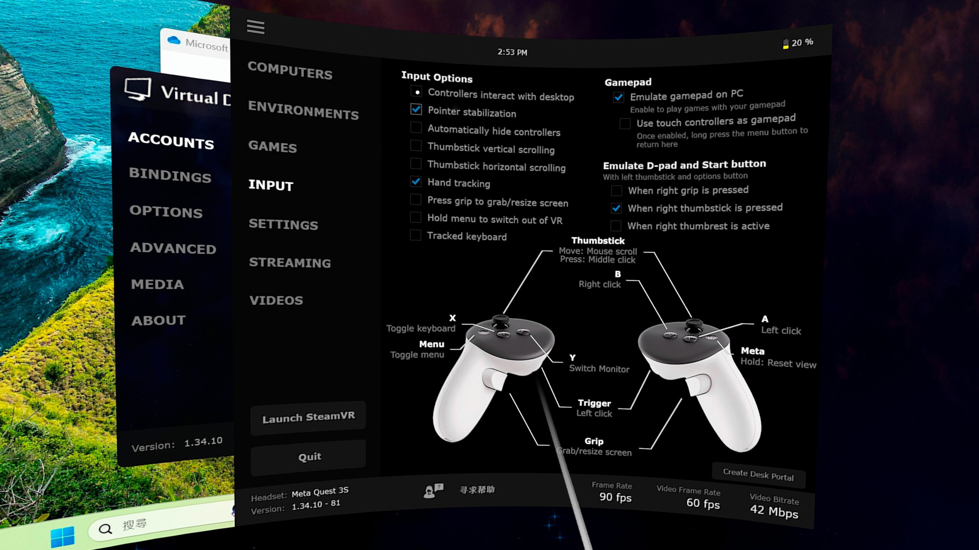 If you’re using the VR headset controller to interact with your desktop, it may cause a cursor conflict. For the best experience, please disable the controller’s desktop interaction feature in the Virtual Desktop interface and use your mouse instead.