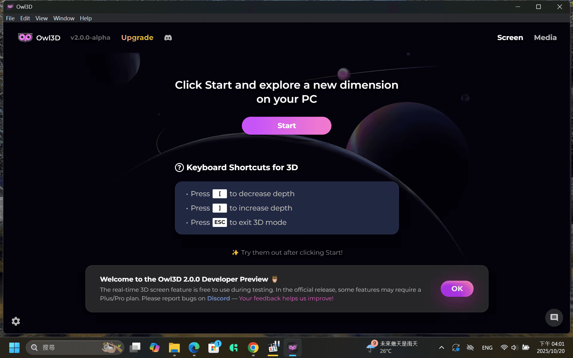 Return to your PC (you can do this via the virtual desktop in VR) and open your Owl3D Screen project. Click the "Start" button.