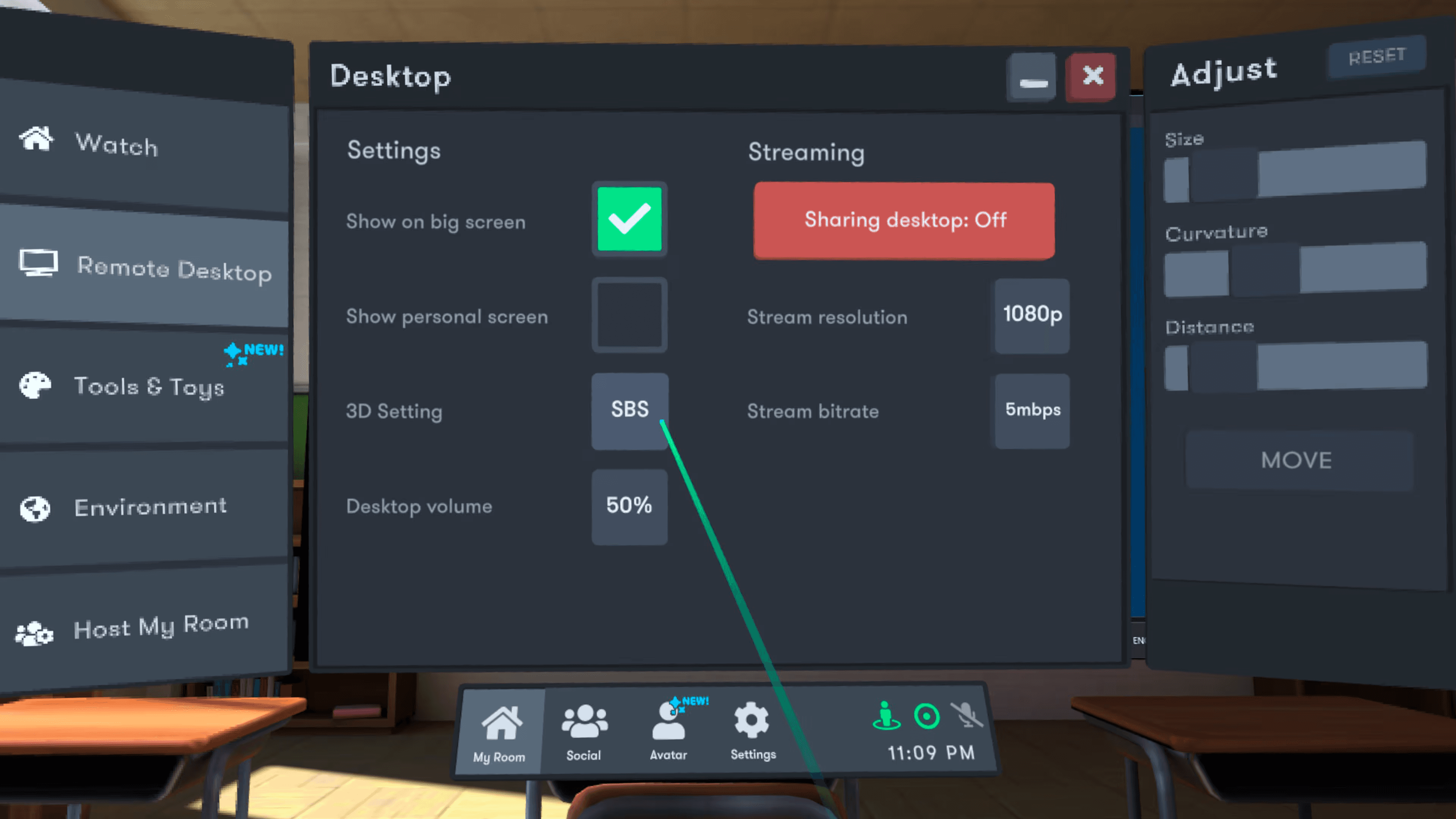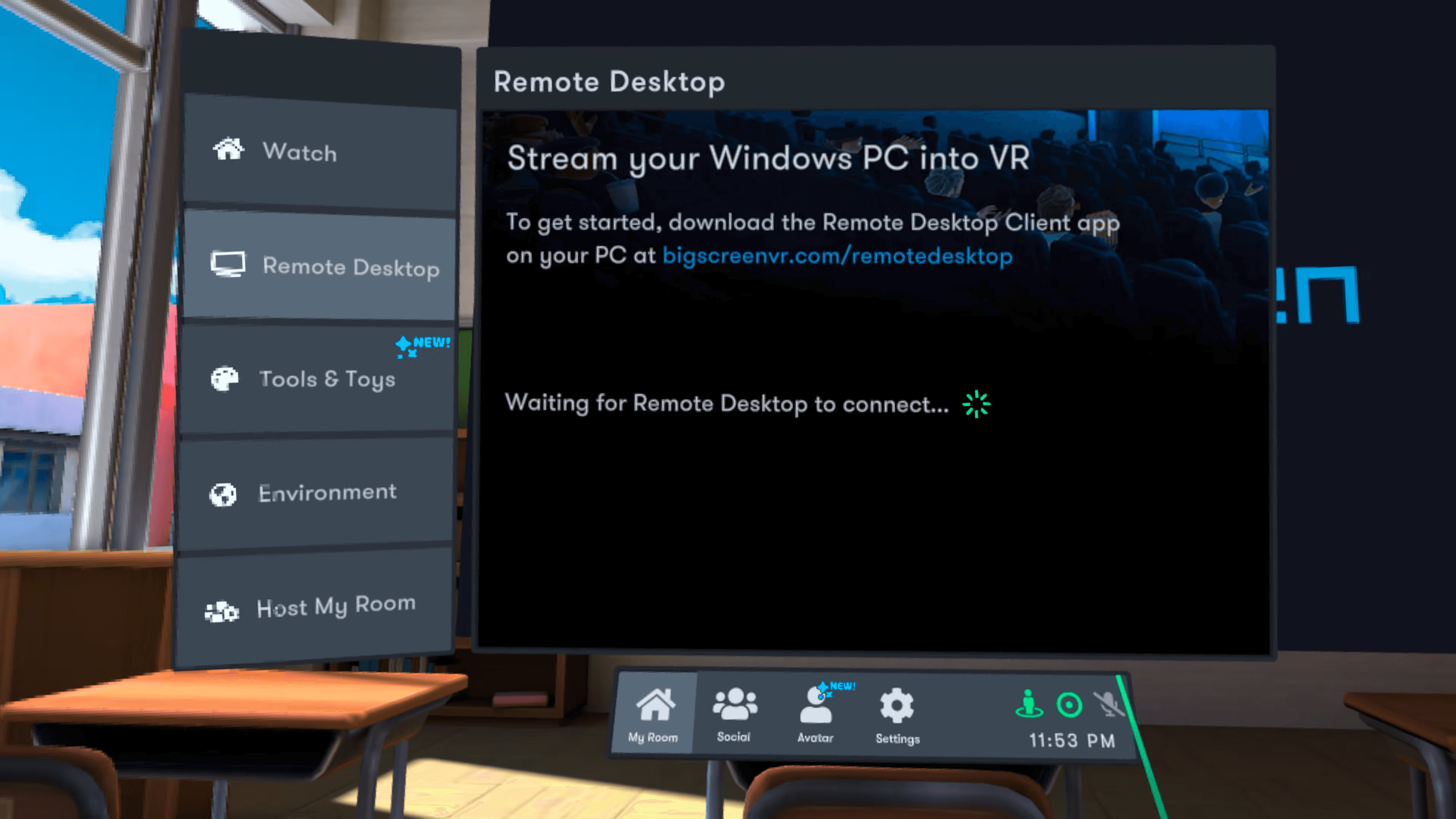 Find Remote Desktop: Open the Bigscreen menu. Look under "My Room" and find "Remote Desktop."
