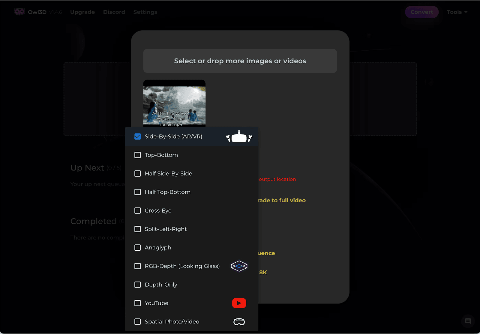 An interface image for uploading video for 3D conversion on Owl3D software.