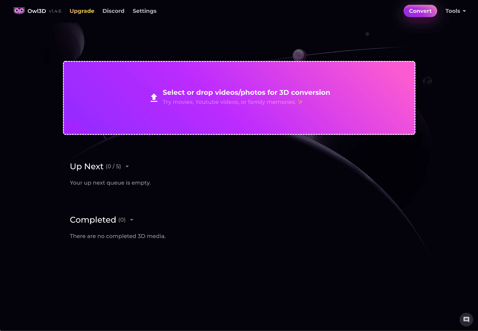 To begin converting a 2D video or photo to 3D, click on the central area or the Convert button in the top-right corner. Select the media file you wish to transform into 3D.